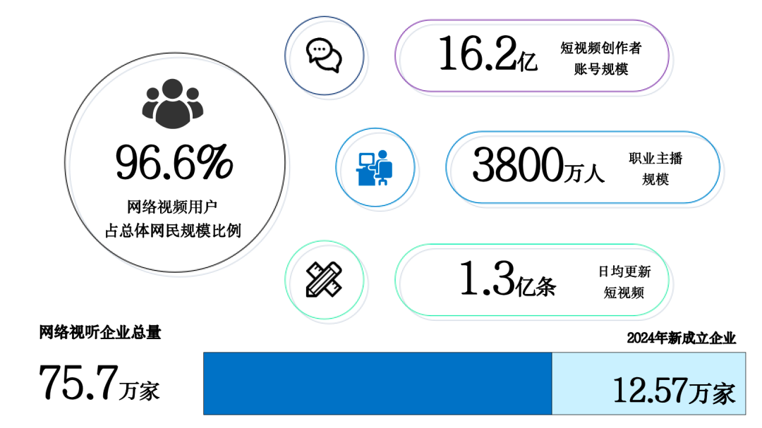全民创作迎来规模与结构的双重跃升。截至2024年底,网络视听产业规模突破1.22万亿元,相关企业总数达到75.7万家,仅2024年就新增12.5万家,新增占比超过16%。网络视频用户超过10.7亿,几乎覆盖全民网络用户;而短视频创作者账号规模也已达16.2亿。全国每日短视频上传量突破1.3亿条。技术赋能,点亮全民创作力。智能终端的普及、网络基础设施的升级,以及平台工具的持续优化,大幅降低了内容生产门槛。商业机制与流量激励的制度化,促使创作者逐步摆脱偶发性的“灵感输出”,转向可持续的职业路径,慢慢成为就业增量与数字经济的重要支撑。