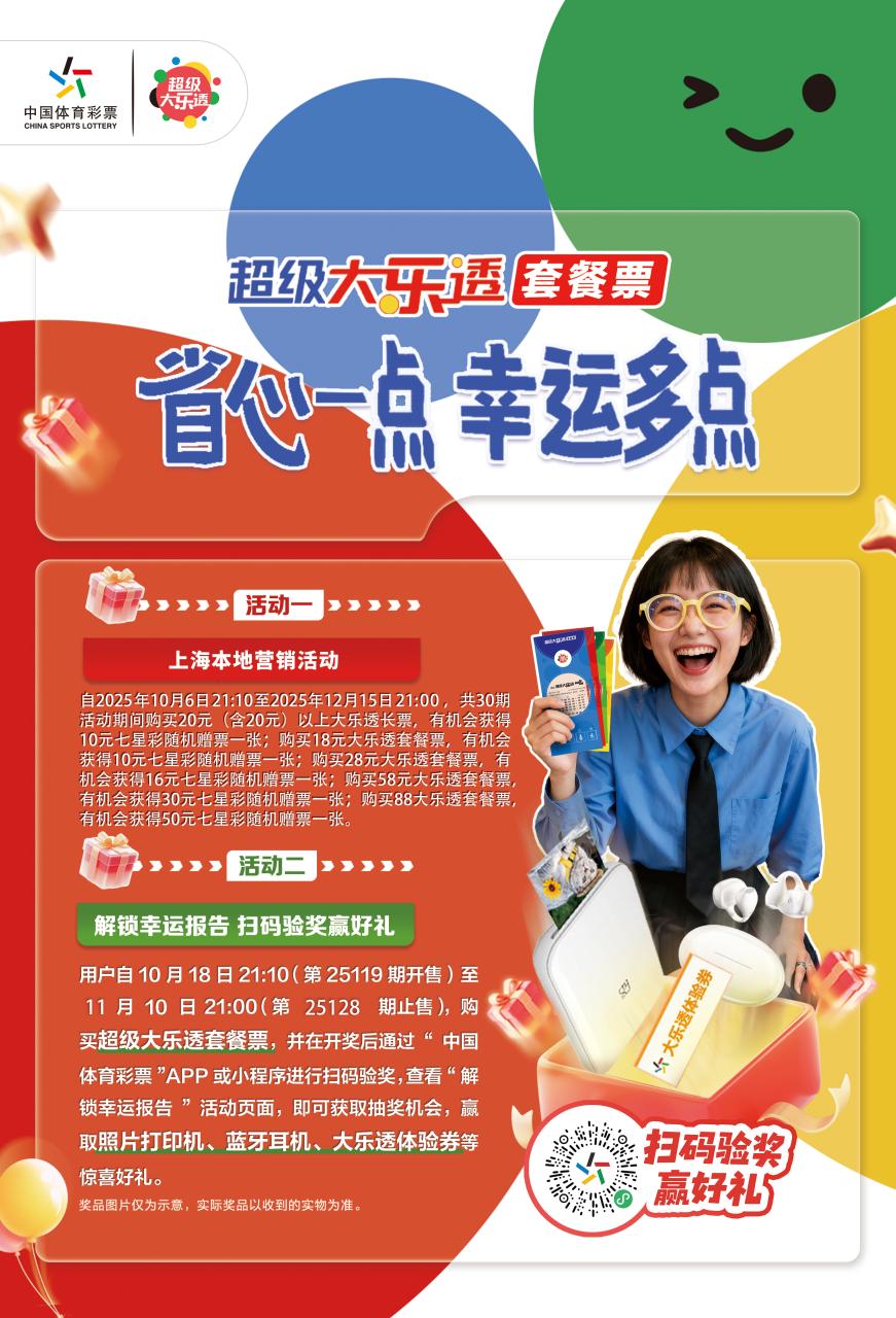 此外,自10月18日21:10(第25119期开售)起至11月10日21:00(第25128期止售),购买超级大乐透套餐票,在开奖后通过“中国体育彩票”APP或小程序进行扫码验奖,查看“解锁幸运报告”活动页面,即可获取抽奖机会,赢取照片打印机、蓝牙耳机、大乐透体验券等惊喜好礼。快来一起收获你的专属好运吧!