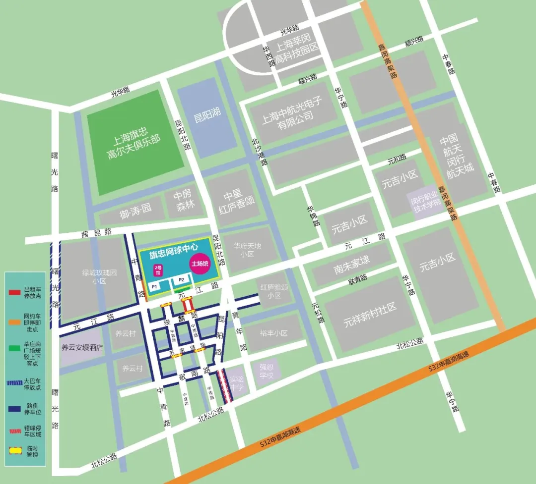 比赛场地久事体育场馆旗忠网球中心位于上海市闵行区元江路5500号,所有观众请从2号门进入(除预约ACE萌友天地的观众外)。欢迎大家选择绿色交通出行!