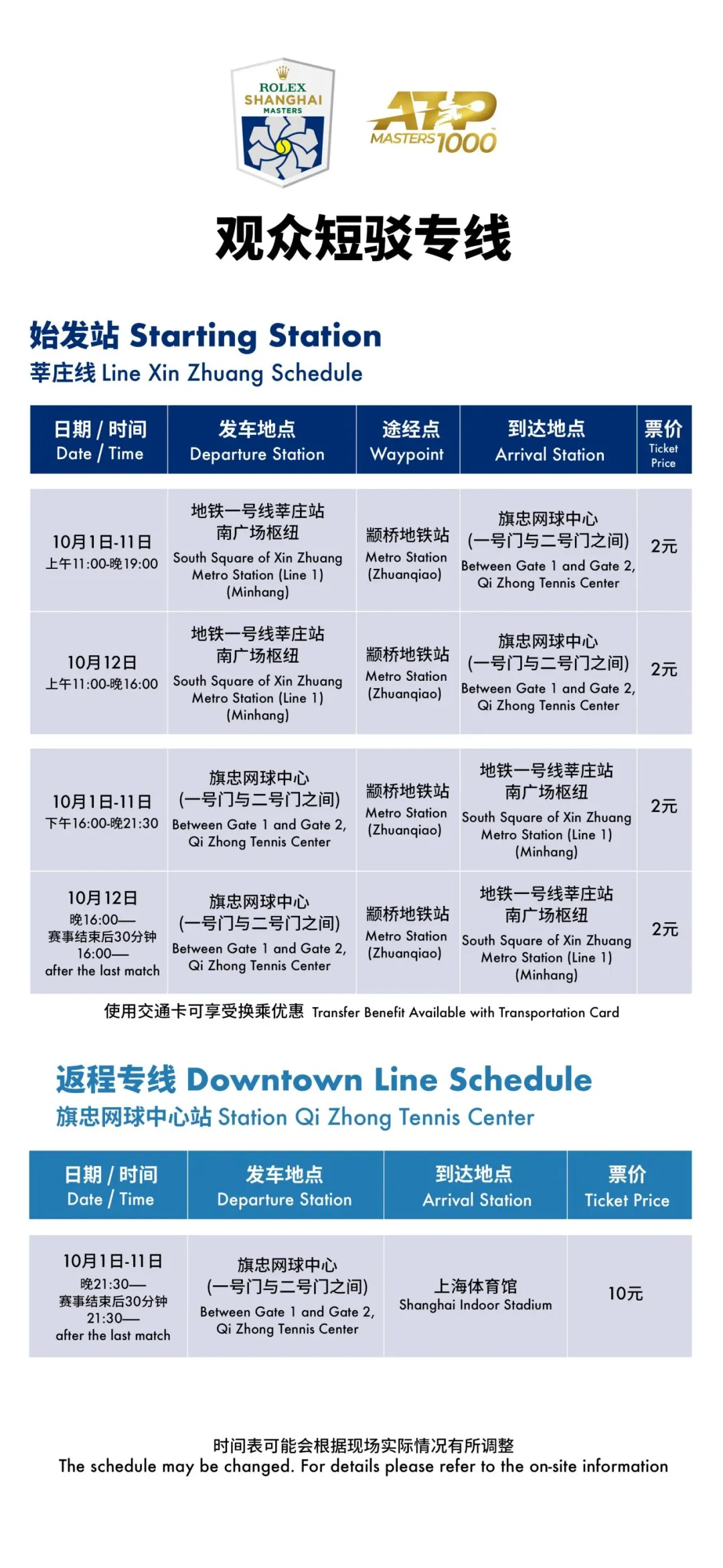 为方便乘坐公共交通的观众观赛,届时将提供地铁一号线莘庄站南广场枢纽-颛桥地铁站-旗忠网球中心往返的观众短驳专线。另外还将提供从旗忠网球中心至上海体育馆的返程专线供选择,确保大家安全返回。