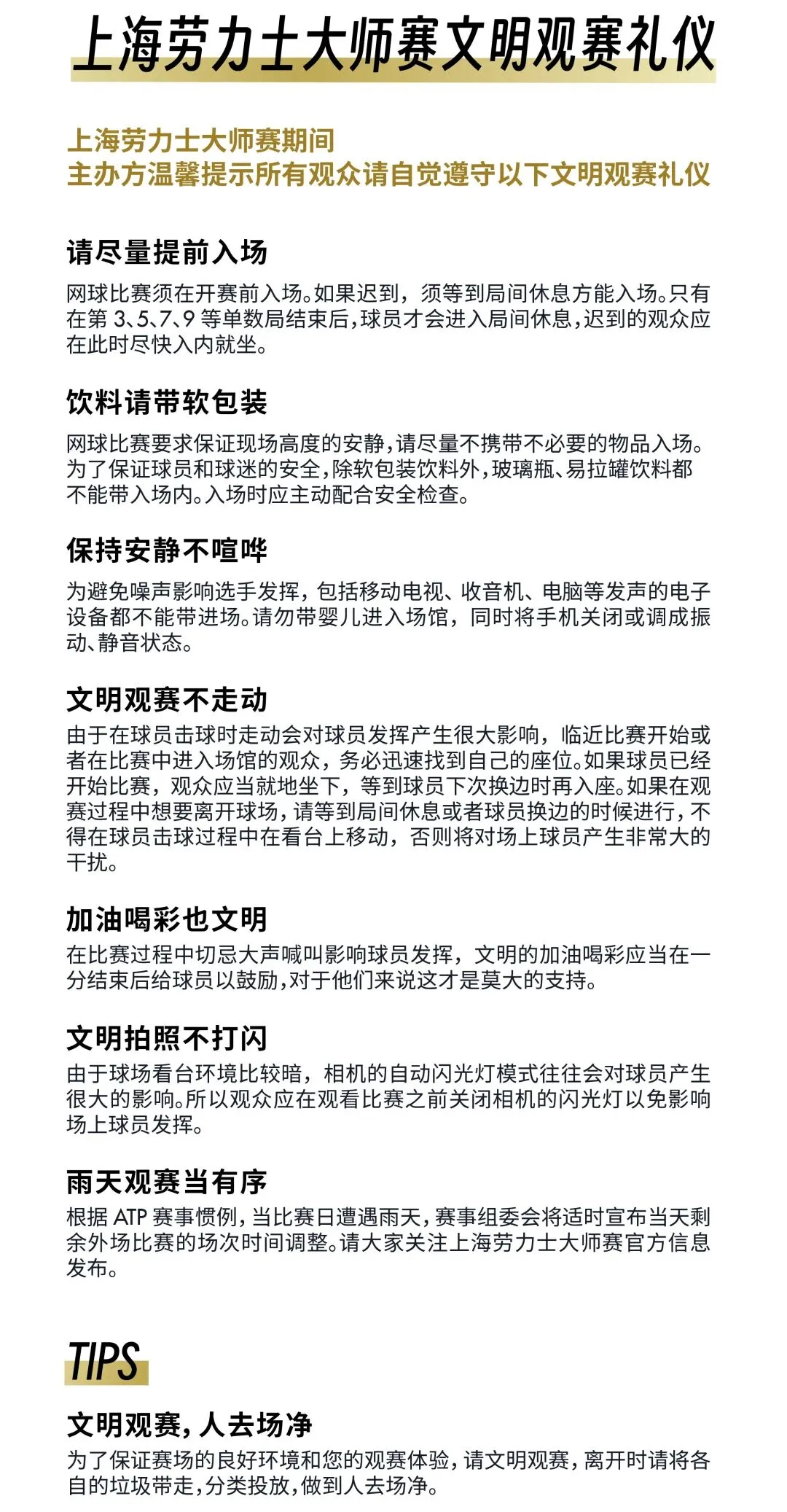 出门前请提前关注天气预报。如果遇到下雨天,根据赛事规则,中央场馆及2号馆的赛事将暂停,待顶棚关闭后继续进行,而其他室外场地比赛将有所调整。请大家及时关注现场大屏、“上海劳力士大师赛”官微等渠道发布的官方信息,注意查收手机短信提示,或至现场咨询亭询问,获取最新赛事安排。
