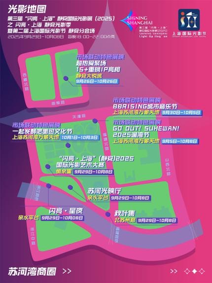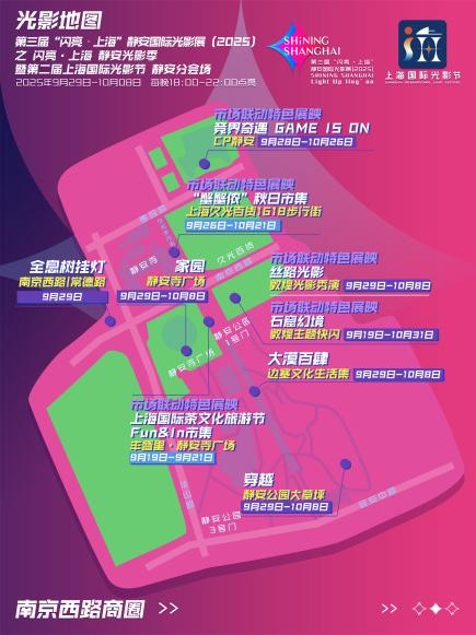 本次“闪亮·上海 静安光影季”暨第二届上海国际光影节静安分会场活动主展期为期10天,将强势聚焦南京西路商圈与苏河湾商圈两大核心区域,于9月29日至10月8日每晚18:00-22:00点亮,构建一场“绚丽光影中的超大体量光影盛会”。