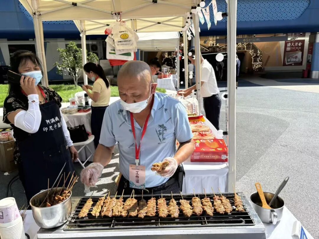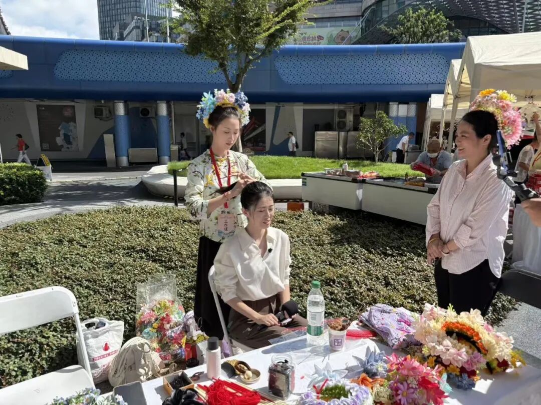 而极具蟳埔特色的簪花体验区更是排起长队,上海市民与游客争相打卡,亲手将绚丽花饰别在发间,沉浸式感受闽南文化魅力,热闹氛围瞬间拉满。值得一提的是,展区内还巧妙融入海丝文化元素,图文展板讲述着泉州特产与海上丝绸之路的千年渊源,短视频滚动播放着泉州丰富美食的传统制作工艺,市民在选购好物的同时,也沉浸式读懂了“泉州味道”背后的文化故事。