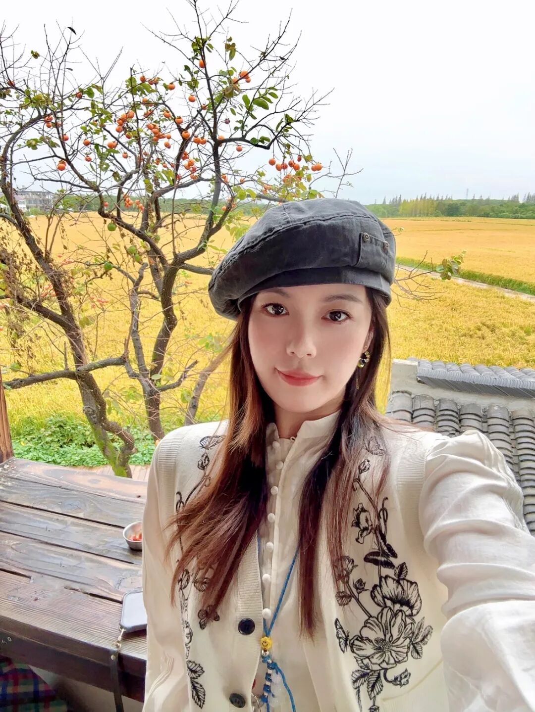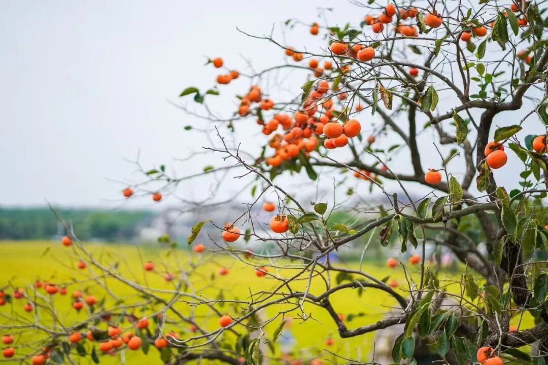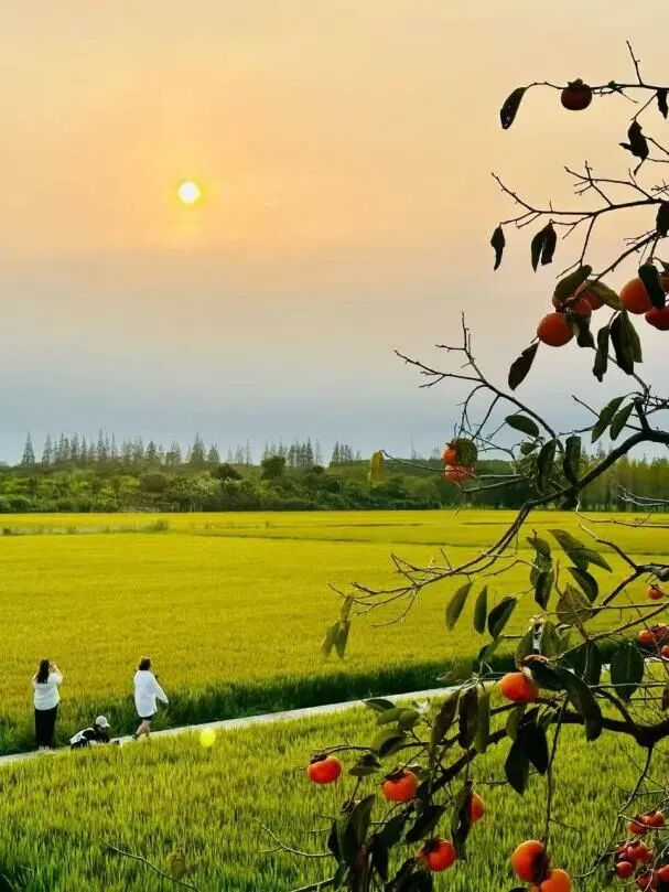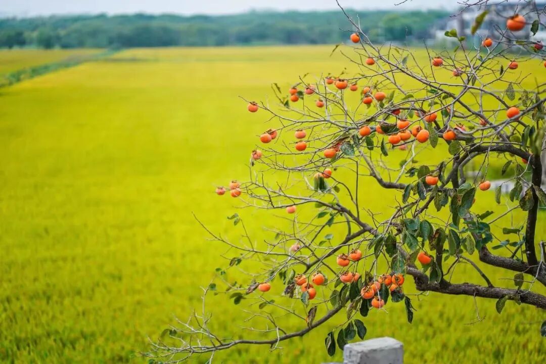 特色:柿子树与金色稻田同框,远处是典型的江南民居,层次分明;