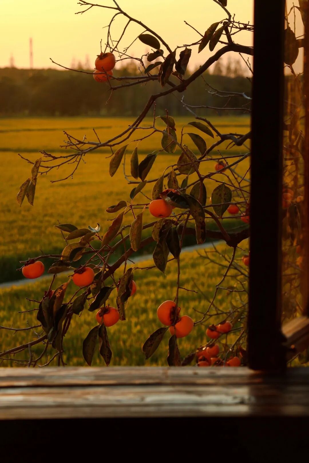 拍摄建议:使用长焦镜头压缩空间,让柿子、稻田和建筑融为一体。