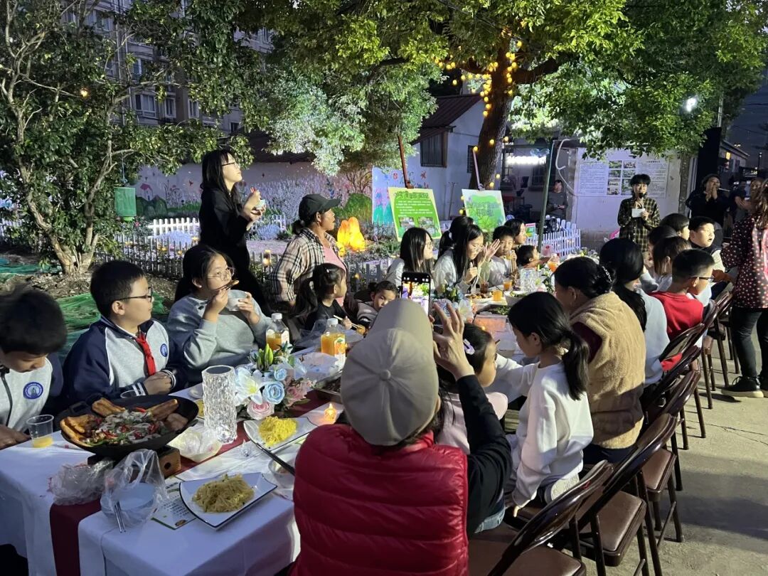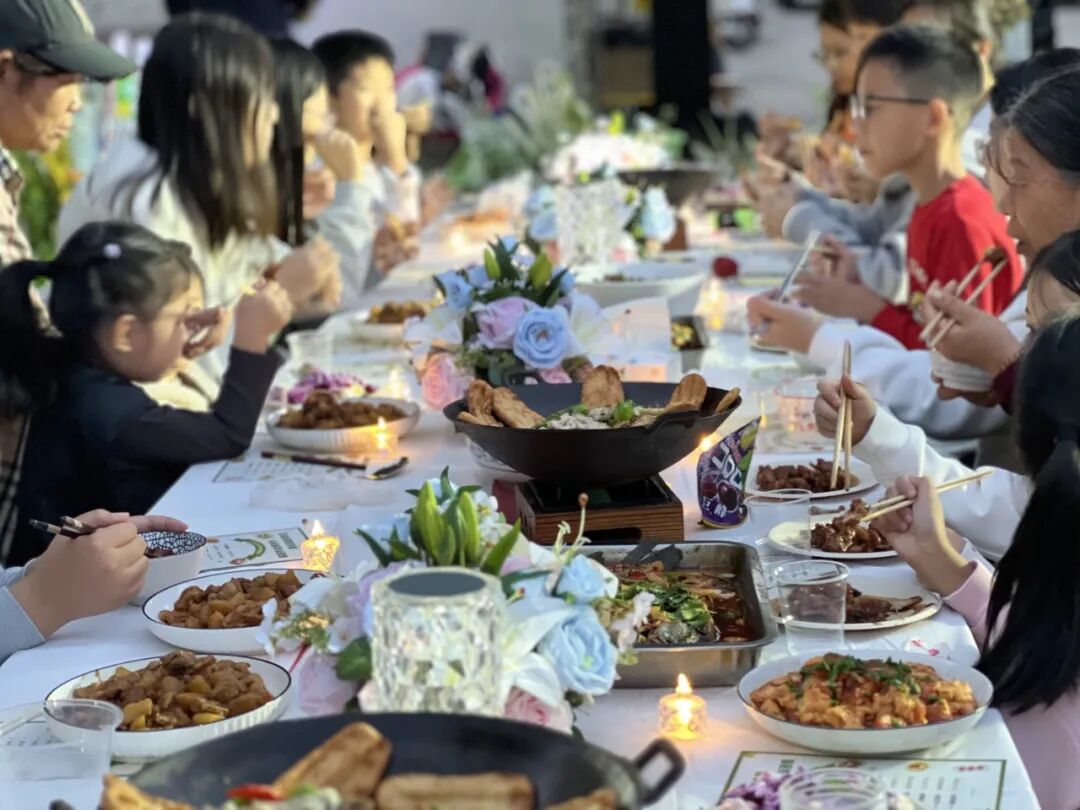 “上菜了!小朋友,让一让……”傍晚五点半,夕阳余晖中,36宅小区却格外热闹。新建的共享花园“童馨园”门前,雪白长桌铺展开,鲜花簇拥、烛火轻摇,氛围温馨。十几位居民带着拿手菜齐聚一堂:红烧肉、水果沙拉、蒜薹炒肉……天南地北的家常味摆满餐桌,香气四溢。大家边吃边聊,谈论社区变化,分享生活点滴,心与心的距离悄然拉近。