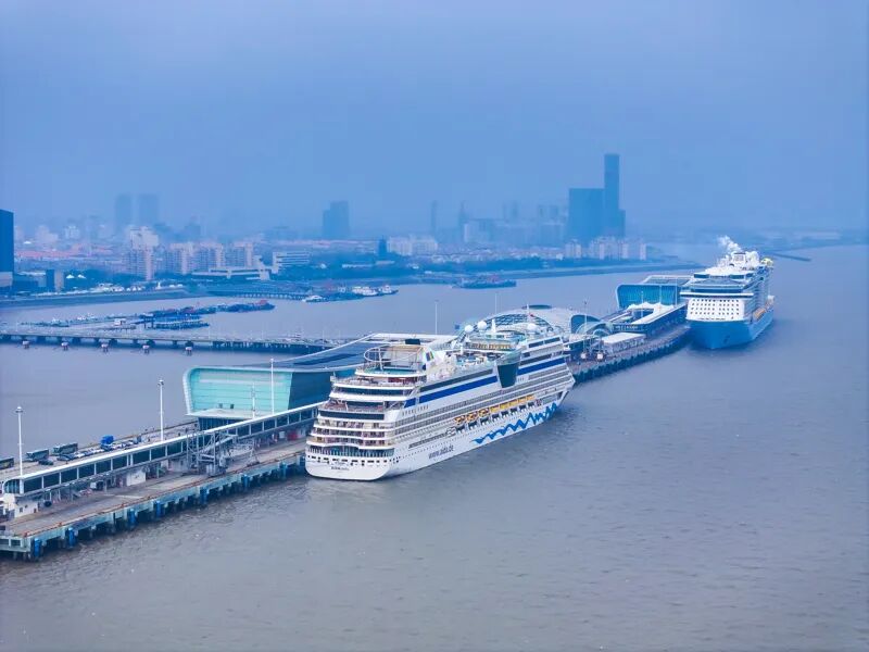 3月16日,“阿依达·星辰号”“海洋光谱号”同时靠泊,吴淞口国际邮轮港单日入境外籍游客创全国新高。张海峰 摄