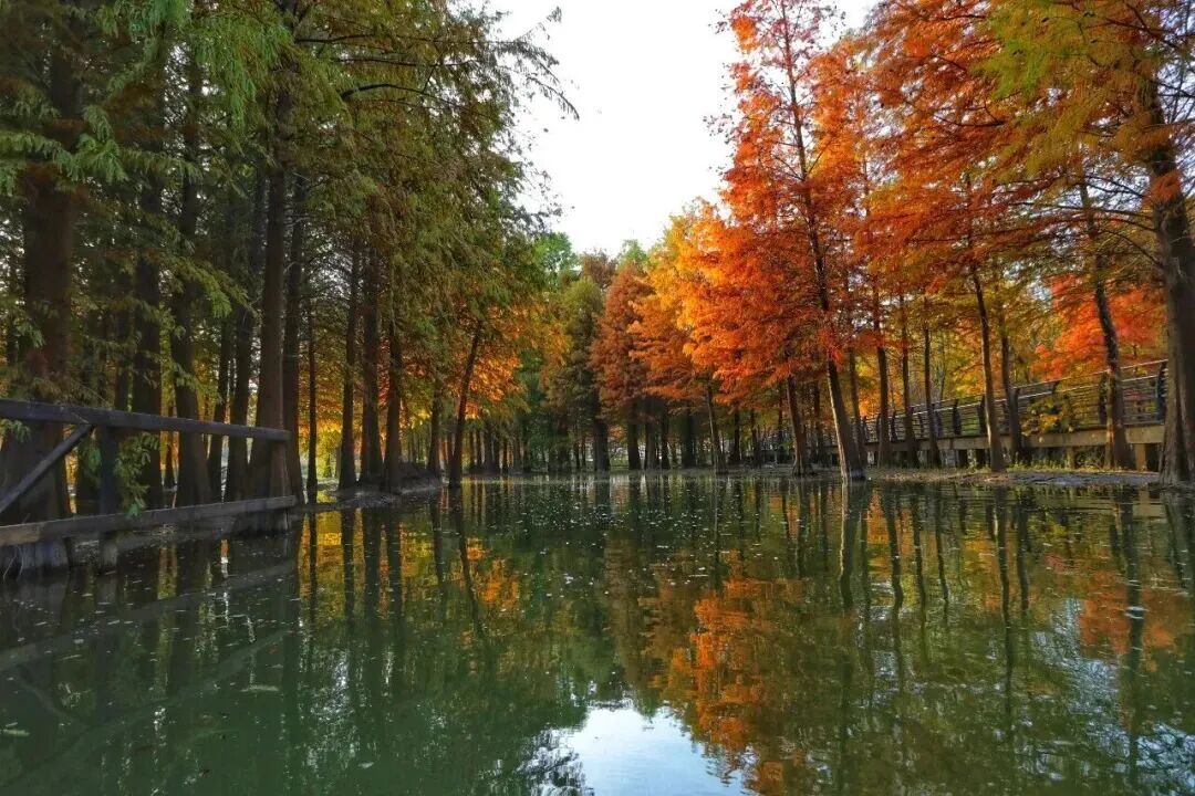 沿岸主要种植有落羽杉、池杉等植物。乘船缓缓驶入深处,可以看秋光层叠、红影婆娑,感受这个季节独有的温柔馈赠。