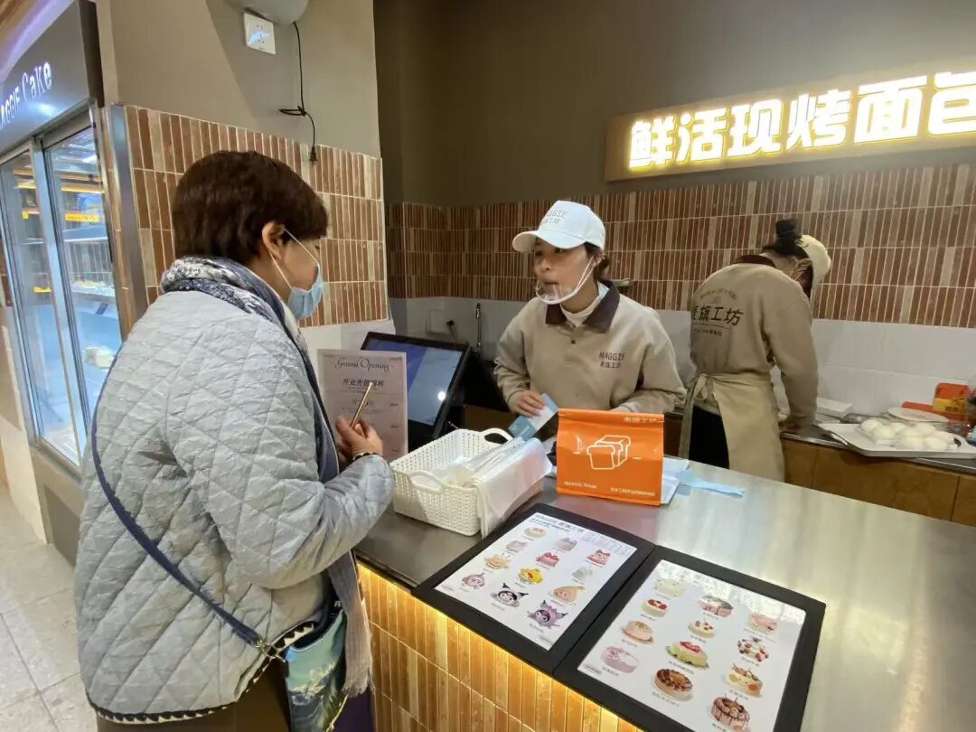上午十时许,烘焙品牌“麦旗工坊”店铺前已人头攒动。一位顾客回购了一盒桃酥,要带给老人品尝;另外一位顾客买了份北海道吐司,当作下午茶点。她告诉记者,开业这天她便来买过,因味道不错,加之会员卡充值折上折,特来回购。