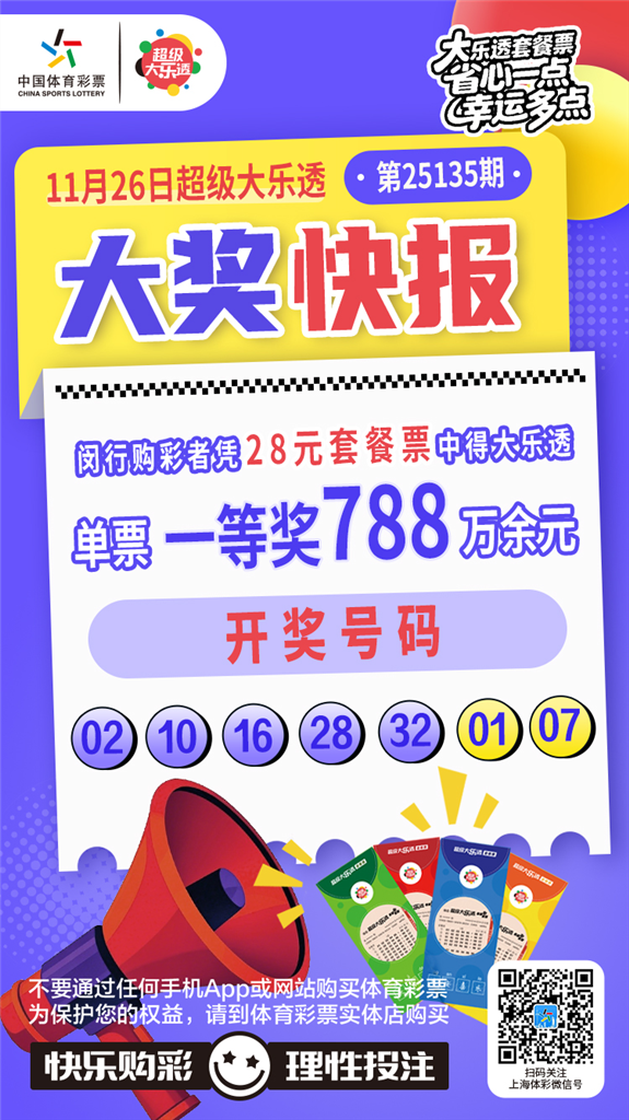 闵行购彩者凭28元套餐票中得大乐透第25135期一等奖