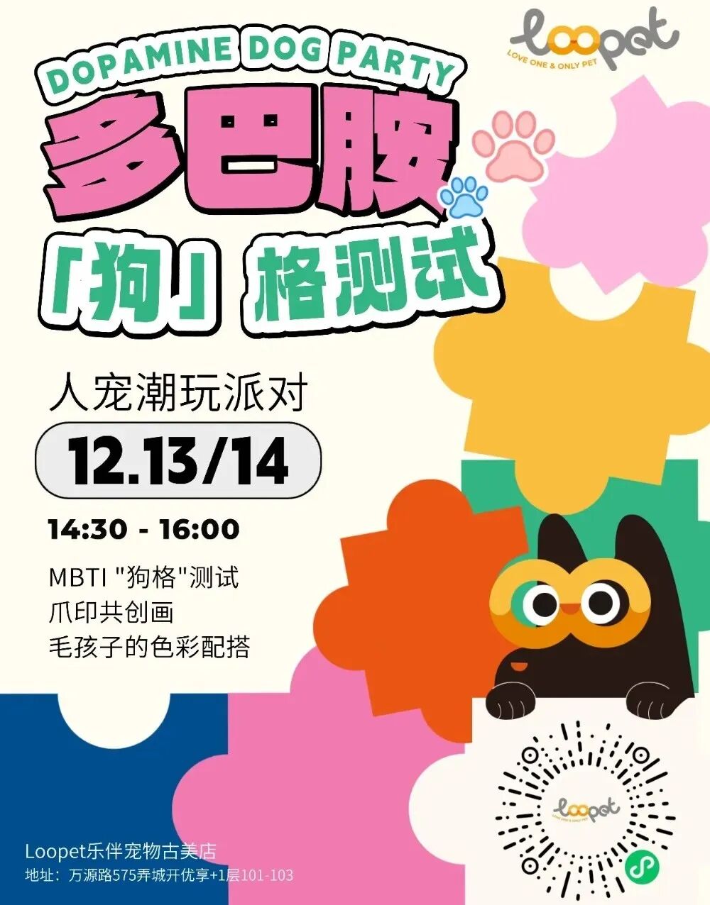 本周末下午(12月13日—12月14日14:30—16:00),店内将为“毛孩子”免费进行MBTI“狗格”测试,为狗狗们搭配时尚穿搭,现场还可制作狗爪DIY画免费带回家,欢迎市民预约参与。