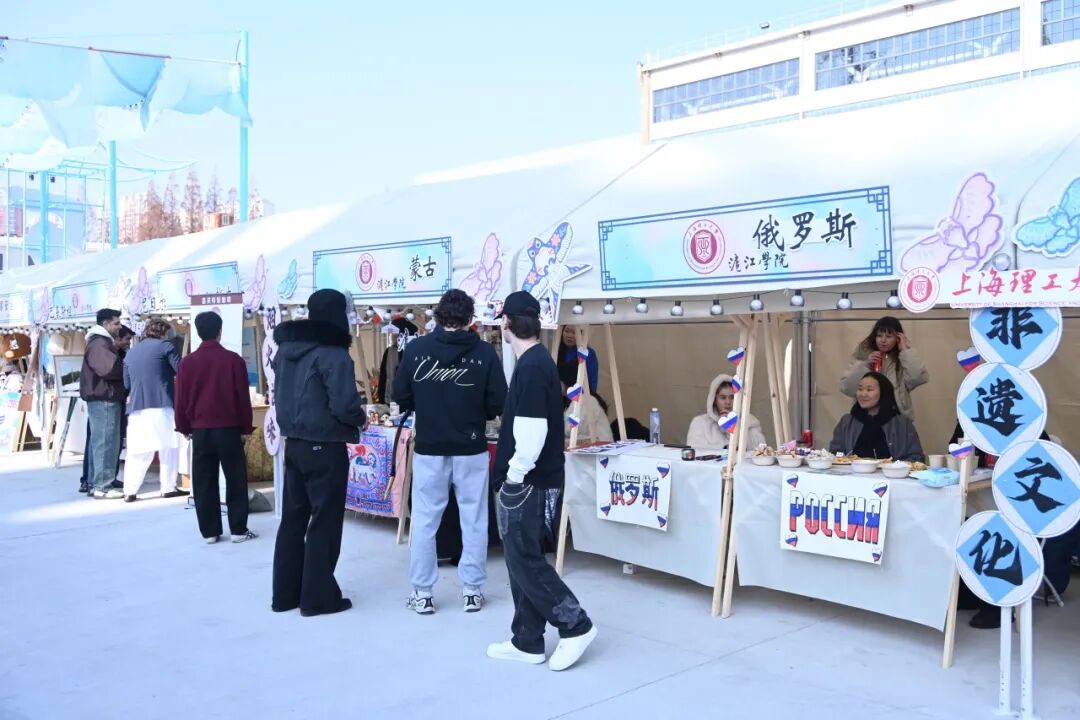市集的“国际范儿”是另一大亮点。一排摊位极具异域风情,上海理工大学沪江学院的留学生们身穿各自国家的传统服饰,热情地展示着特色文化。例如来自土库曼斯坦的萨帕、阿里和桑佳尔,与来自俄罗斯、蒙古等国的同学一起,摆出了传统美食与手工艺品摊位。