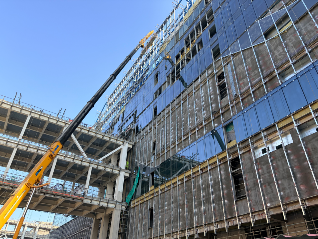 变化最显著的要数外立面。三个标段的外墙与连廊龙骨全部架设完成,部分幕墙单元已开始安装。