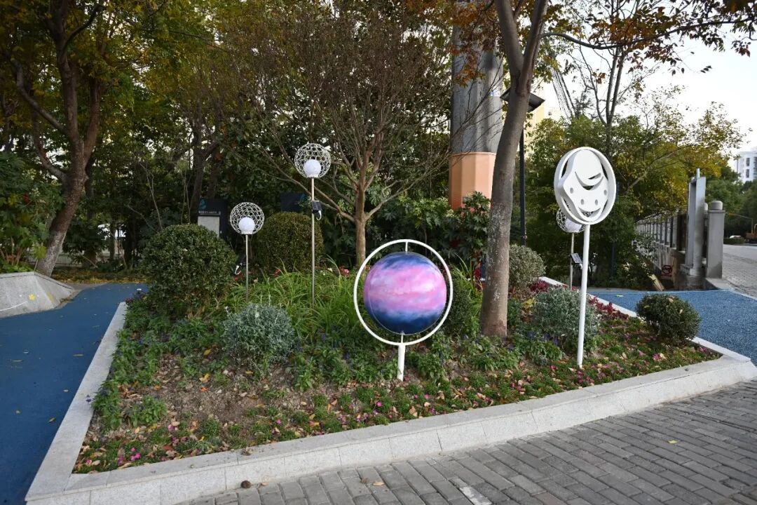 而在平南路莲花路街角,花坛立面上涂鸦着关于星球和航天飞机的彩绘;一颗颗“星球”从花境中长了出来;航天主题的灯泡和艺术装置与一街之隔古美儿童友好公园相映成趣。