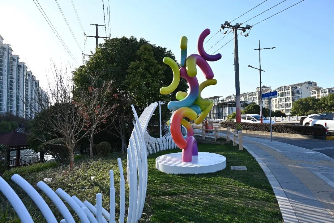 多巴胺色系的半圆形层层叠起,每道弧线都是笑意的绽放,背后的白色弧形围栏如起伏的波浪,映衬得雕塑更具活力……这座名为“笑的N次方”的雕塑点亮了街角。作品以嘴部的“微笑弧线”为元素,用柔润的彩条交织成流动的笑意——紫的舒展、虹的渐变,共同诠释着包容与共创之美。