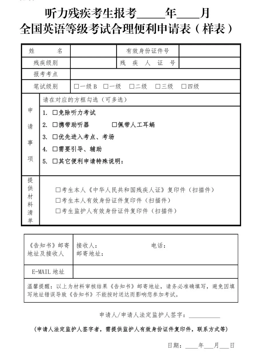 4.听力残疾考生可申请相关合理便利事项。考生报名成功后,须在报名结束后5日内,携带本人居民身份证及复印件(若为考生法定监护人代为申请,须同时提供监护人的相关有效身份证件及复印件)、第二代及以上《中华人民共和国残疾人证》及复印件、《听力残疾考生报考全国英语等级考试合理便利申请表》(详见下方)到报考考点提交听力合理便利申请材料。