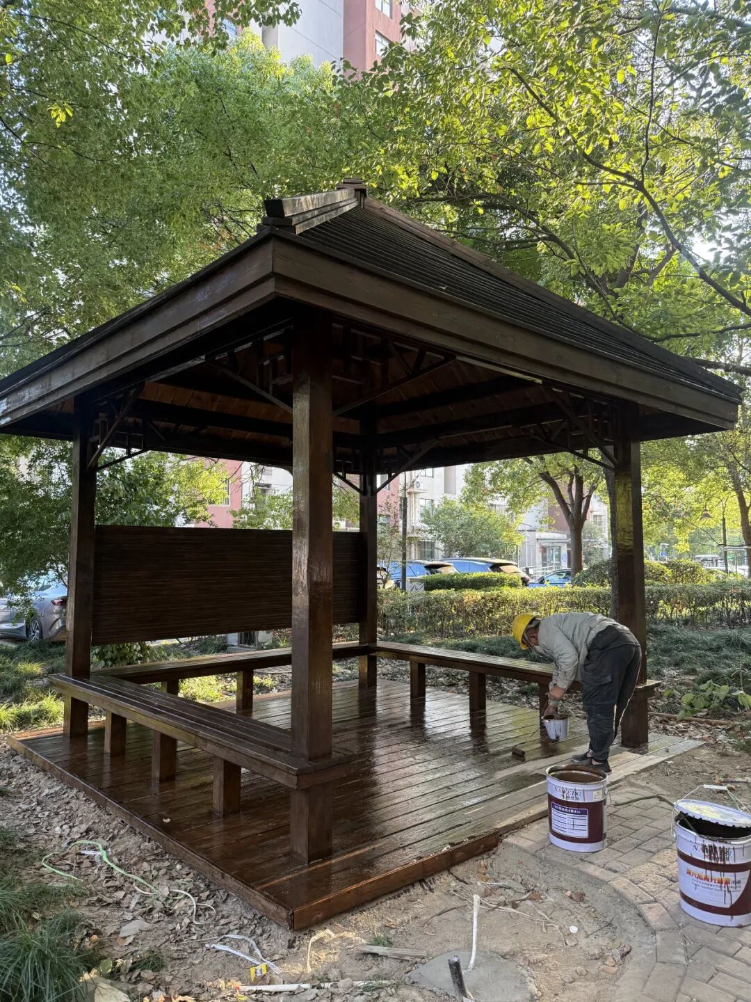 •选用环保耐候的棕色油漆均匀涂刷,既抵御风雨侵蚀,又与社区景观风格相得益彰,让老旧凉亭重焕整洁新颜;