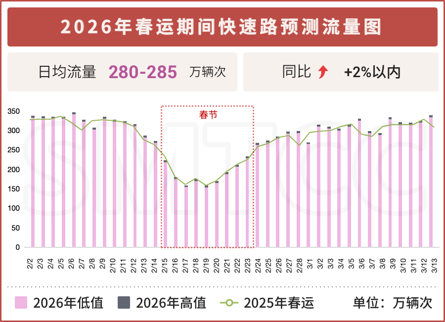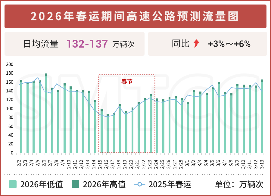 随着探亲流、学生流、务工流、旅游流多重叠加,2026年春运期间出行需求持续增长,高速公路流量呈上升趋势。预计2026年春运期间高速公路日均流量132—137万辆次,同比增长3%—6%。