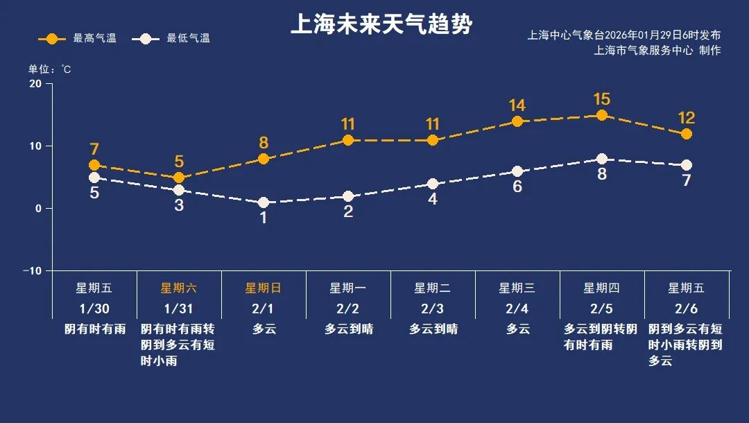 明天早上开始飘雨,早间出行注意道路交通安全。雨水打压,明天气温仅在5~7℃之间。周六降水持续,气温下降至5℃以下,体感更冷。伴随气温下降,夜间本市西部和北部地区可能会出现短时小雨夹雪。周日早间气温来到近期低点,白天转为多云天气,气温逐日回升。下周初天气晴好,周中最高气温有望升至14~15℃。