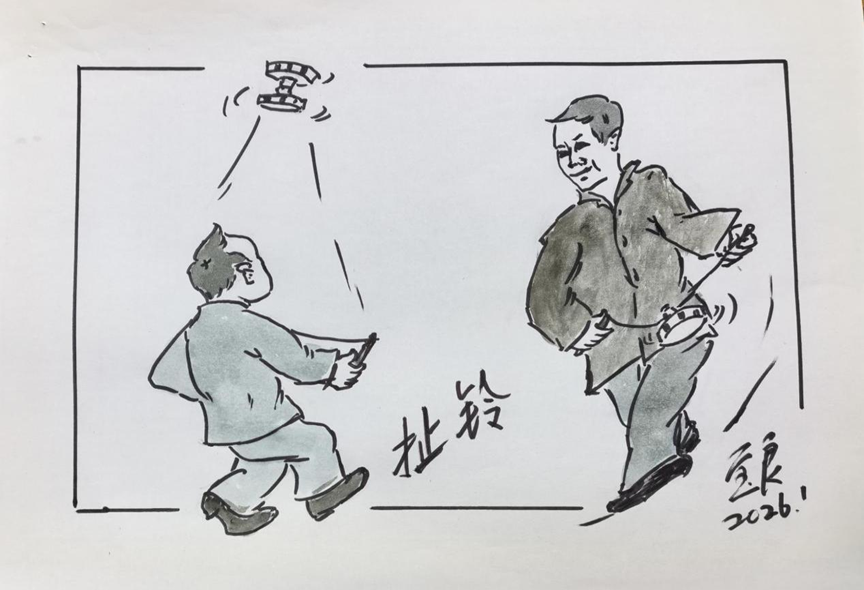 扯铃:一般都是在过年时买下的玩具,分单响、双响两种,所以又叫“响铃、空竹”。缠在小棍上的一根线,绕在响铃上随势扯啊扯,旋转的响铃上的孔在空气的作用下发出“嗡嗡”响声。有人还像耍杂技一样把旋转的响铃高高抛起,再安然接住继续扯,惊险中透出他的绝技。