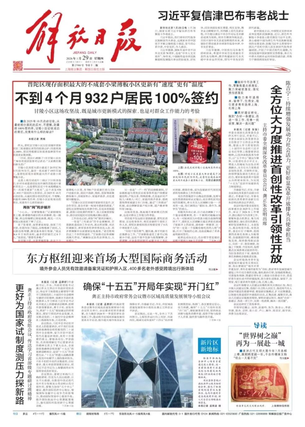 1月29日,《解放日报》头版头条报道甘陵小区,《不到4个月全部签约!上海这区十年最大旧改收官,有居民曾在街道干部面前拍桌子,最后带动居民主动签约》(←点击链接查看)