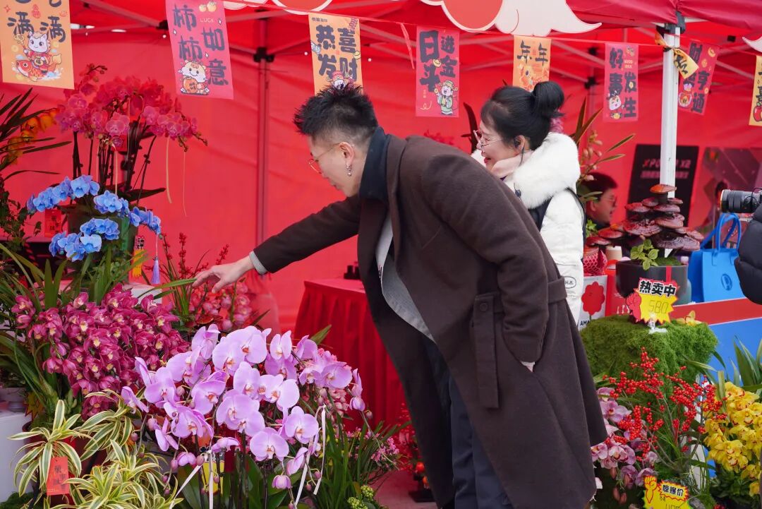 新春市集突破传统年货展销模式,创新构建“吉市+花市+房市”三维体验空间,打造“一站式”社区美好生活微缩场景。
