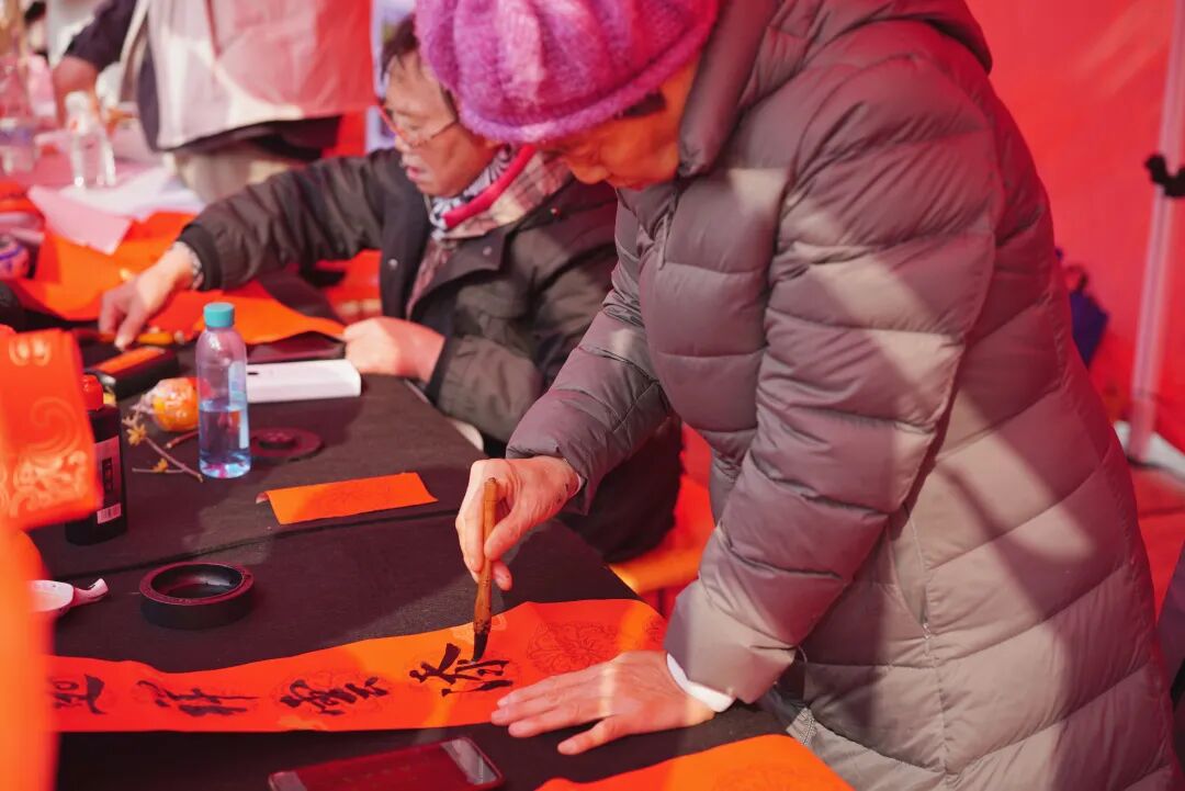 “翰墨送福·春联万家”专区前,马桥书法协会的老师们现场挥毫泼墨,定制春联与“福”字免费领,市民们排着长队等候这份专属的新春祝福。“非遗新演·狮舞迎春”环节中,灵动的手狮舞动态展演吸睛无数。