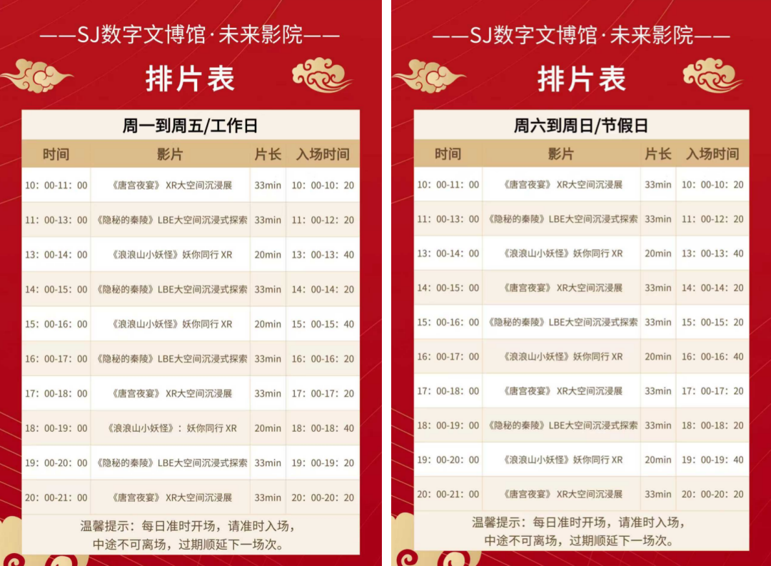 “国家电影局颁发的虚拟现实电影的001号和002号,都在我们这里。”SJ数字文博馆“未来影院”总经理盛芊羽言谈中不无自豪。除了《唐宫夜宴XR》,在“未来影院”,《隐秘的秦陵》也在同步上映,再加上《浪浪山小妖怪:妖你同行XR》,三部影片都是具有“龙标”的虚拟现实电影。这也让“未来影院”的排片更为丰富,构建起覆盖多朝代、多IP的VR电影排片矩阵。“除了受邀参加‘唐宫夜宴’,你还可以跟随考古队员探秘秦陵,化身‘浪浪山小妖怪’,跟随剧情去‘打怪’。”