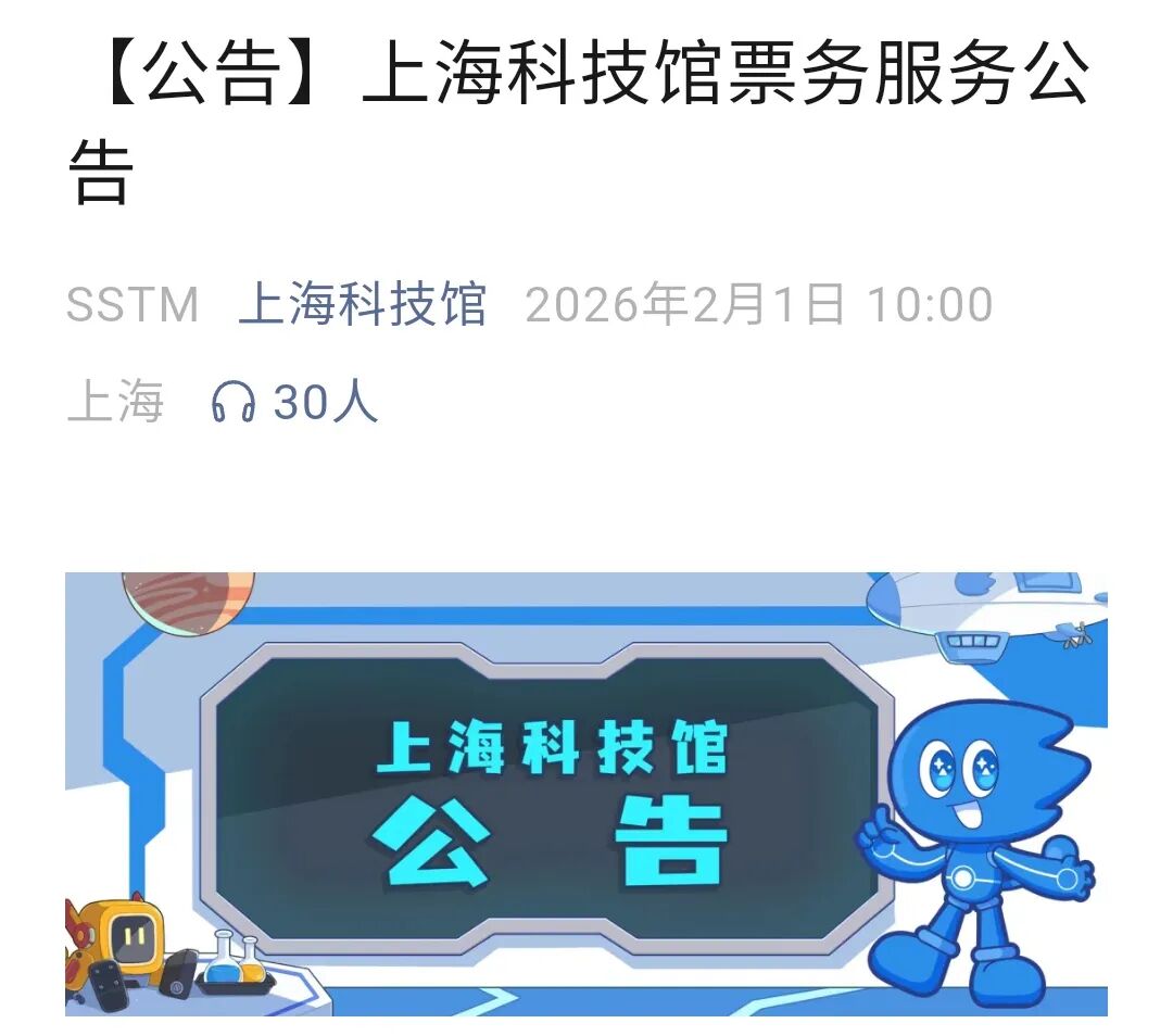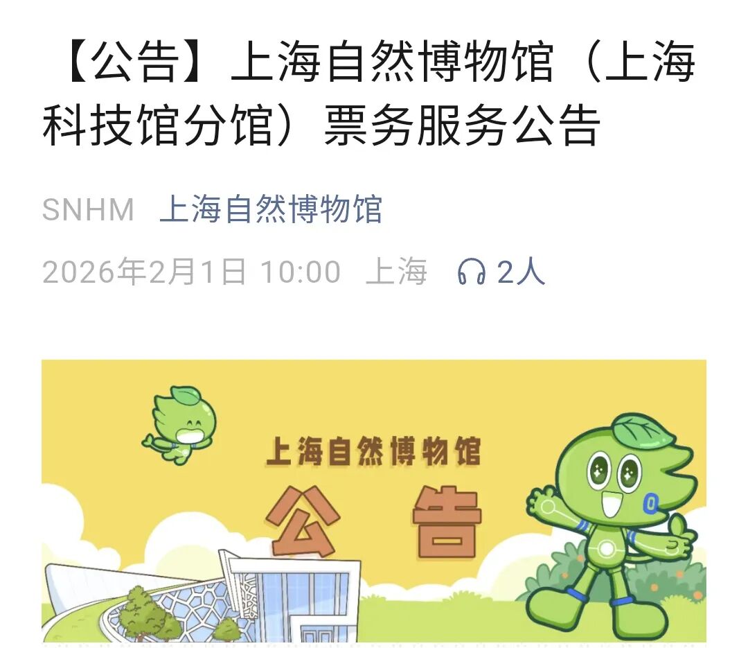 2月1日上海科技馆、上海自然博物馆(上海科技馆分馆)和上海天文馆(上海科技馆分馆)分别在官方微信公众号发布票务服务公告:将自2026年2月17日起对票务规则进行优化,实施退票费机制。