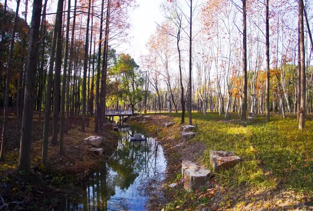 水与林成为新杨公园最鲜明的生态底色。公园充分依托桃浦地区被誉为最美河道的“南北厅”及新杨湖、新槎浦、走马塘等多水交汇的独特肌理,通过连通、扩宽、净化等手段,对原有水域进行了全面生态修复。打通断点串联起分散水体形成循环流动的活水网络,增强了水体的自净能力和区域防洪排涝的韧性,还将水域总面积由原来的3.6公顷提升至4.1公顷。