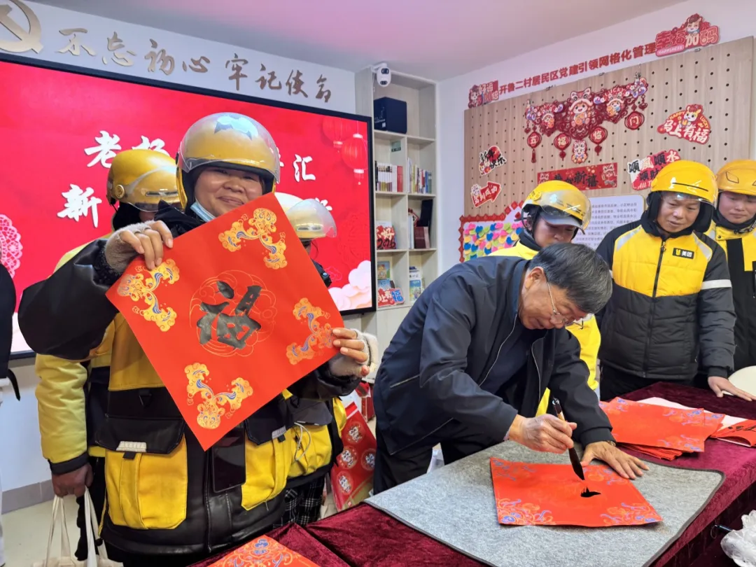 活动尾声,一副副火红的春联和“福”字送到骑手手中,笑容洋溢的合影定格了温馨时光。马年将至,“老杨树”的年轮里镌刻着奉献与传承,无数如骑手般的“城市骏马”正奔跑出生活的希望。这场相遇,是冬日里的一份温暖礼物,更是对“人民城市”建设的朴素诠释——在这里,每一份奋斗都被尊重,每一个期盼都被聆听,所有人共同奔向更加和谐美好的明天。