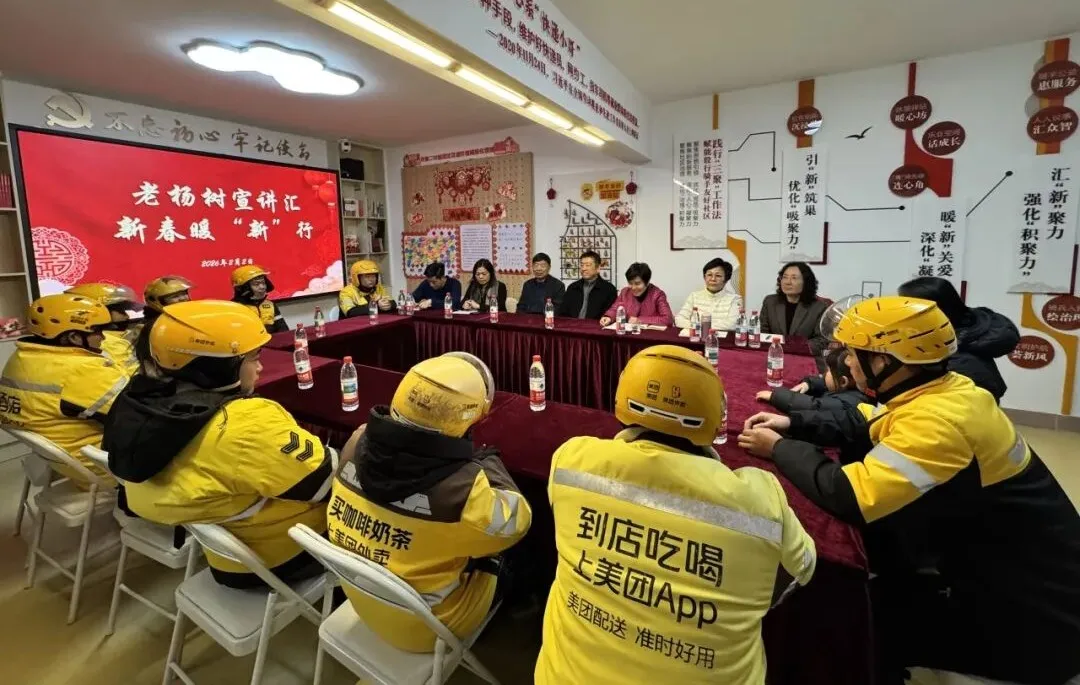 2月2日,区委老干部局联合殷行街道党工委、美团(上海)党委,在殷行街道袋鼠宝贝之家举办了“老杨树宣讲汇”新春暖“新”行活动。团队结合党的二十届四中全会精神学习,通过互联网企业党建指导员工作平台,走近新就业群体,与年轻骑手等面对面交流,送理论,送温暖,送关爱。