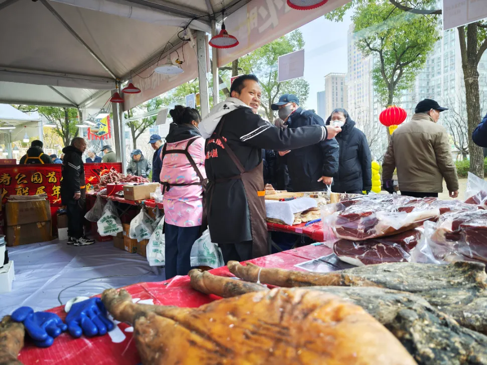 “我们带来了三年的老火腿,分为去皮和不去皮两种,吃起来软糯鲜香,不管是蒸百叶、烧菜饭,还是白切着吃,味道都特别好。”摊主一边给市民打包,一边介绍,“这次特意带来了2吨多货,争取全部卖完,开开心心回家过年。”