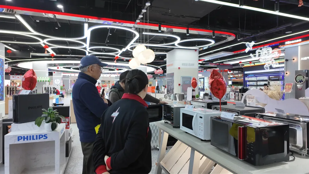 2月5日是新优惠举措首日,百联中环京东家电店刚开门便客流涌动、咨询不断,店员们主动向顾客介绍新补贴政策。
