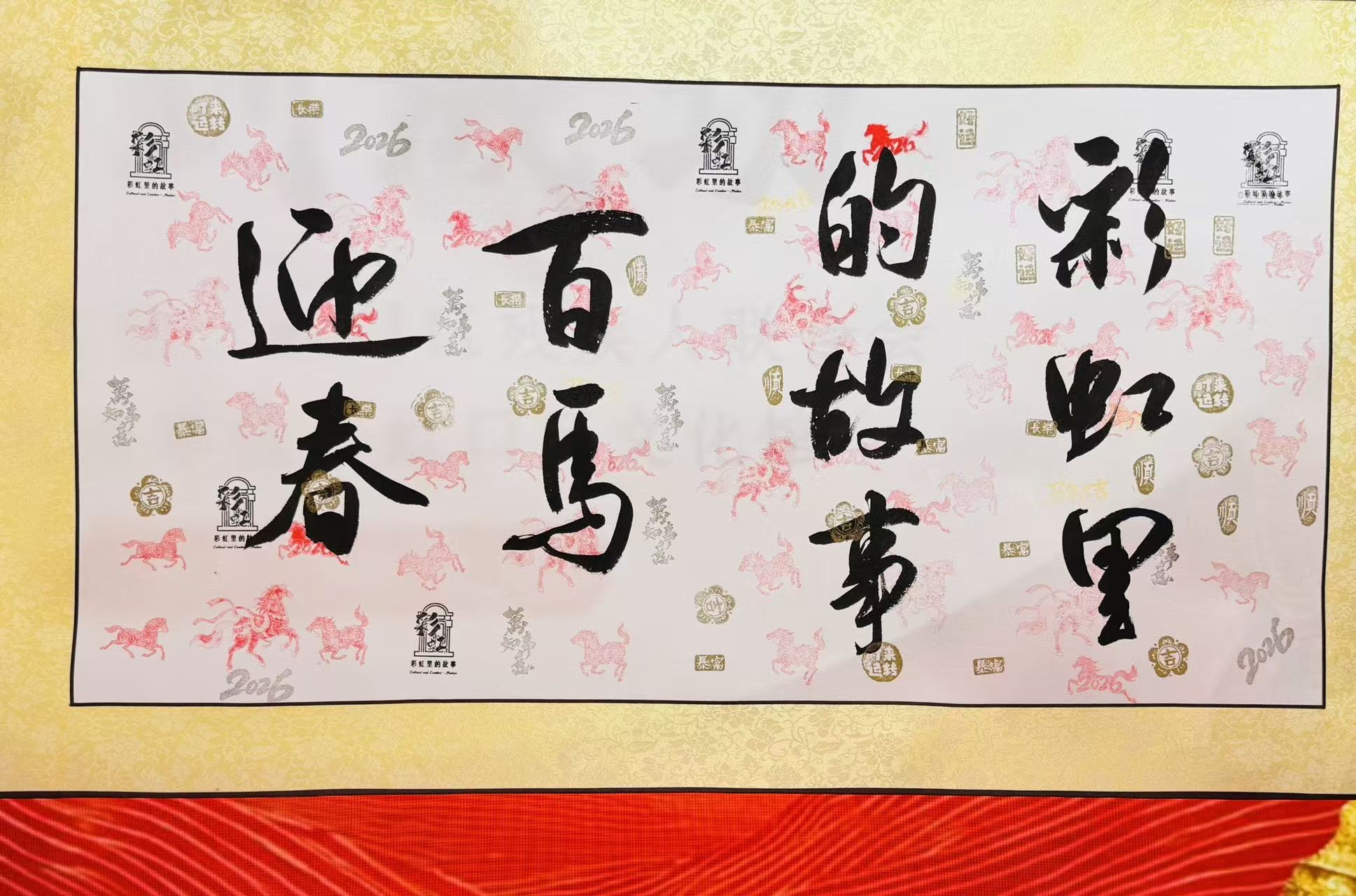 在“同心共创·万马奔腾”互动区,参与者通过一种富有创意的方式留下属于自己的新春印记:残疾人朋友选取心仪的马年图案印章,亲手盖印签到。随着活动推进,一枚枚姿态各异的“骏马”逐渐汇聚成生动的奔腾长卷,象征携手同行、共赴前程的美好寓意。在活动临近尾声时,大家共同以书法为画卷题字落款,笔墨点染间,一幅残健同心、协作完成的新春作品圆满呈现。