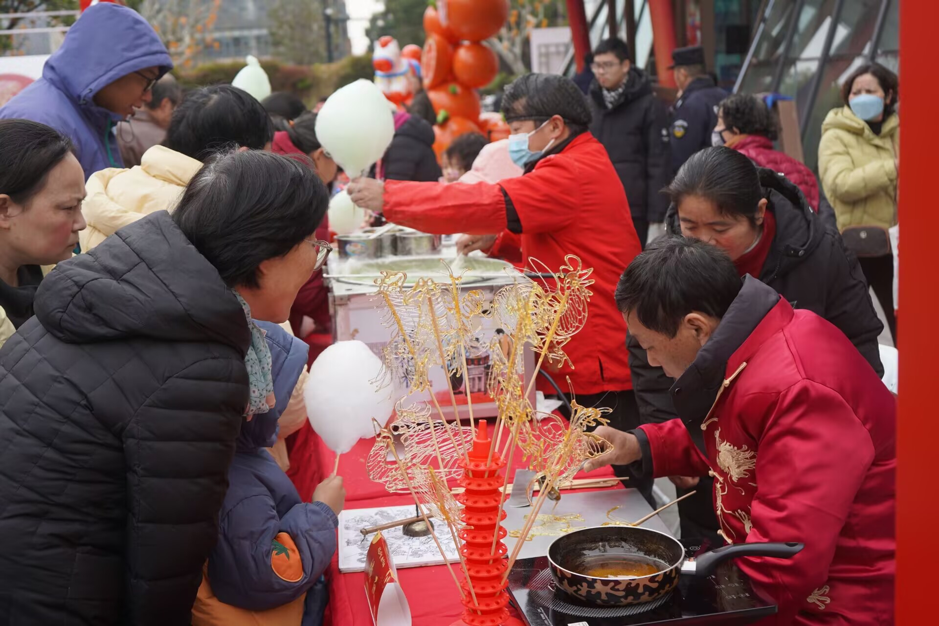 糖画的甜香在空气里飘散,装点气氛的中国结流苏轻飘,青浦区桥梓湾广场一片热闹欢乐景象。2月10日,由盈浦街道承办的2026年青浦区“我们的节日·春节”主题系列活动城中会场在这里举行。活动以“共筑温暖家·欢度幸福年”为主题,通过文艺演出、民俗体验、健康服务等多种形式,为市民营造出喜庆祥和、充满温情的节日氛围,同时也标志着青浦迎新春系列文化活动火热开启。