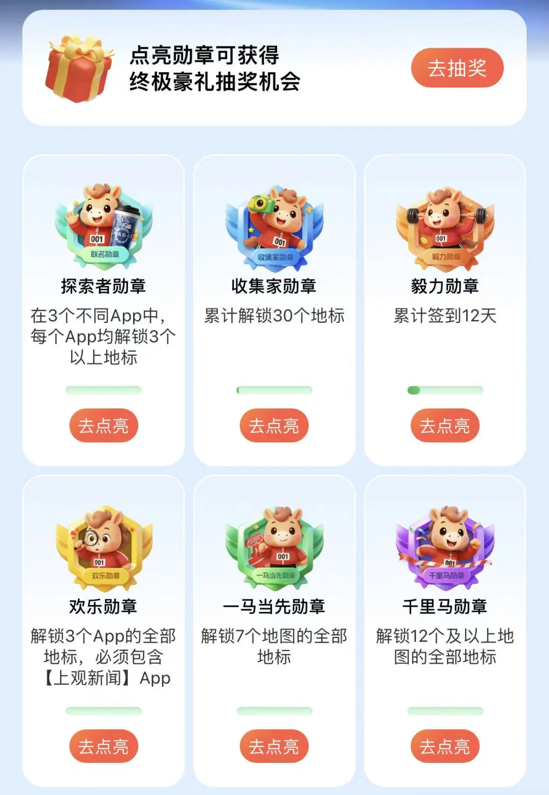千里马勋章:解锁12个及以上APP全部地标,奖励800融耀值,额外兑换4次抽奖机会。