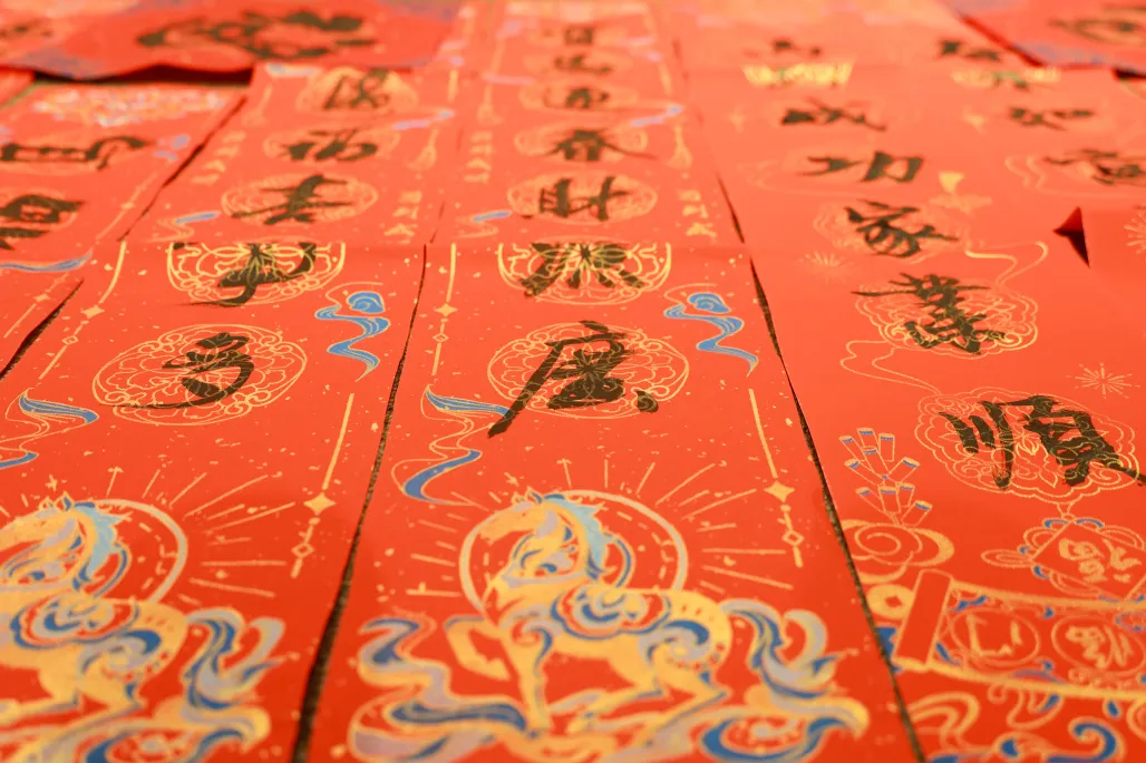 一旁,众多写好的作品已有序铺陈开来,如同红色的波浪,映衬得整个空间暖意融融。细细浏览,其中既有“新春大吉鸿运开,佳岁平安福满堂”等通用吉联,也有“马驰万里传捷报,羊跃千山送佳音”等马年特色祝福;既有大气浑厚的“福”字,也有俏皮活泼的“福马”字样,都承载着书法家们的满满心意。