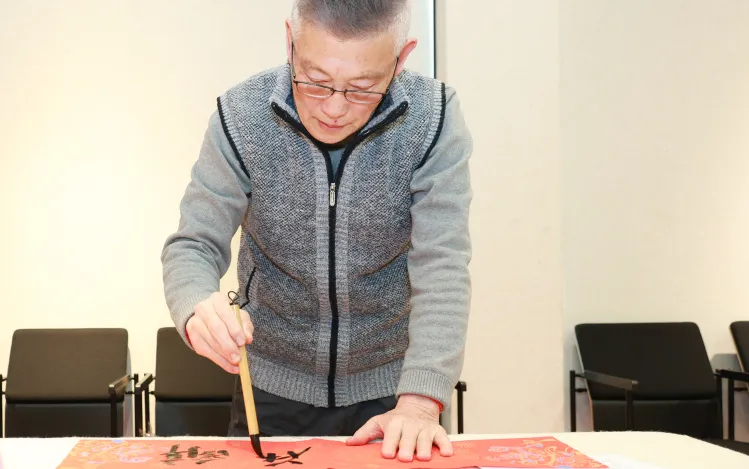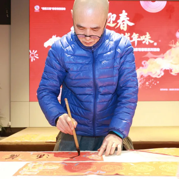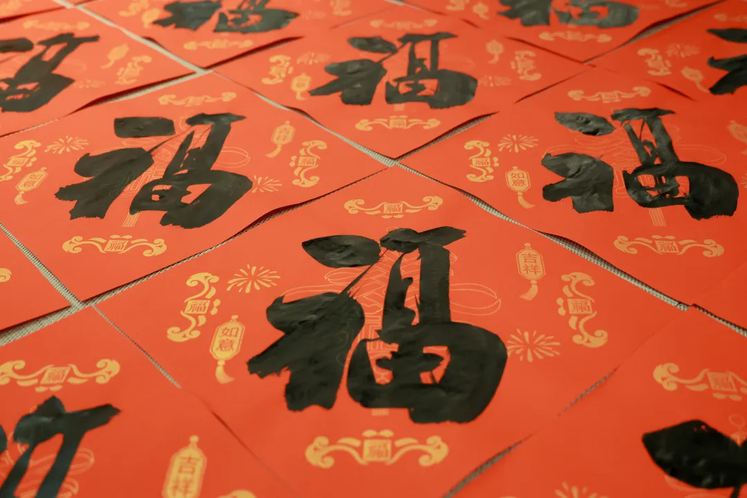 活动现场被一片喜庆的“中国红”装点。一张张长桌上,大幅的红纸依次铺开,书法家们凝神运腕,笔锋在红纸上稳健行走,行云流水之间,一副副春联与一张张“福”字在笔下诞生。