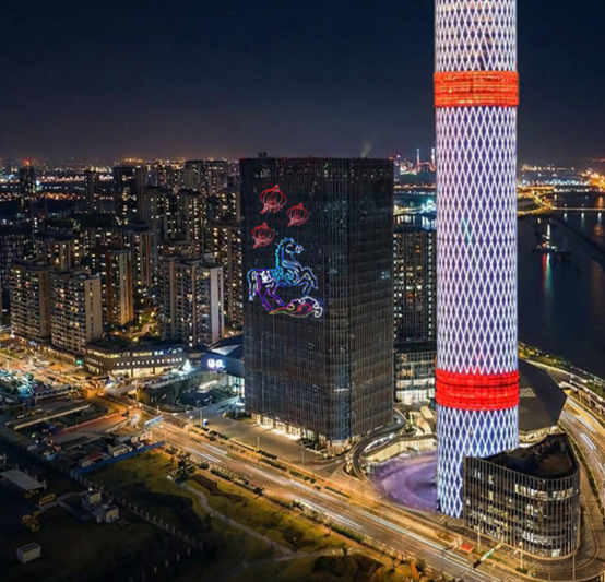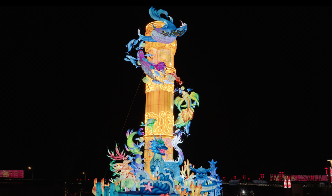 “沧溟升柱”:神兽溯流盘柱而上,光影如水奔涌——江畔夜色,跃动着新年的光。