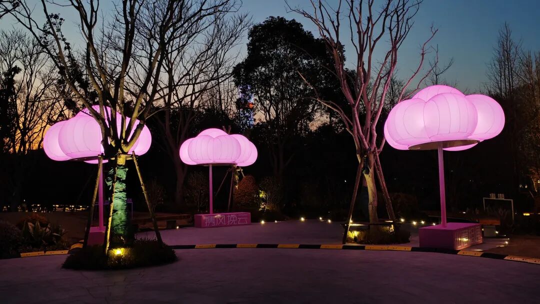 “携风挽云”:云朵灯组轻染夜色,把心愿系在柔软的光里。