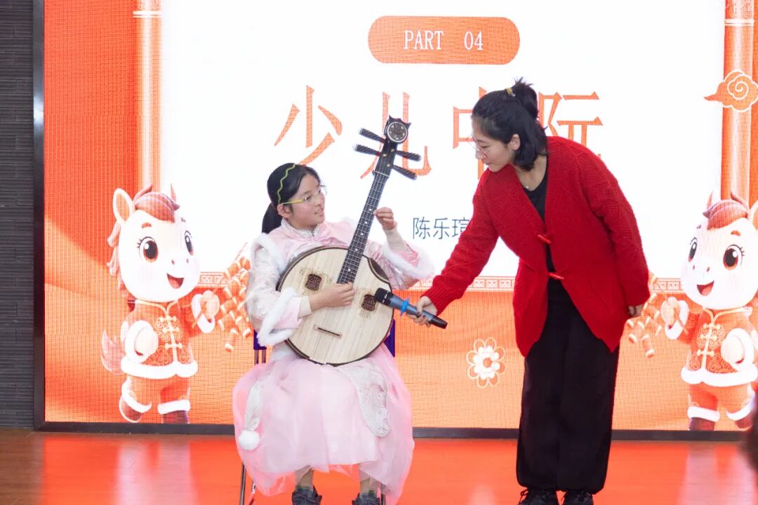 鼓点一响,年味瞬间被点燃。《吉鼓献瑞》的铿锵节奏拉开了整场晚会的序幕,《游击队之歌》《祝福祖国》的旋律在会场回荡,台上台下心意相通。舞蹈、朗诵、戏曲、器乐轮番登场:红衣翻飞的舞姿如骏马踏春,朗诵《老有老的骄傲》里藏着银发居民的自信与从容,沪剧、越剧与少儿中阮独奏相互交融,让传统与童真在同一舞台相遇。互动环节中,“逛三园”“抽奖”把气氛一次次推向高潮,马年吉祥物和春联在欢笑中传递。