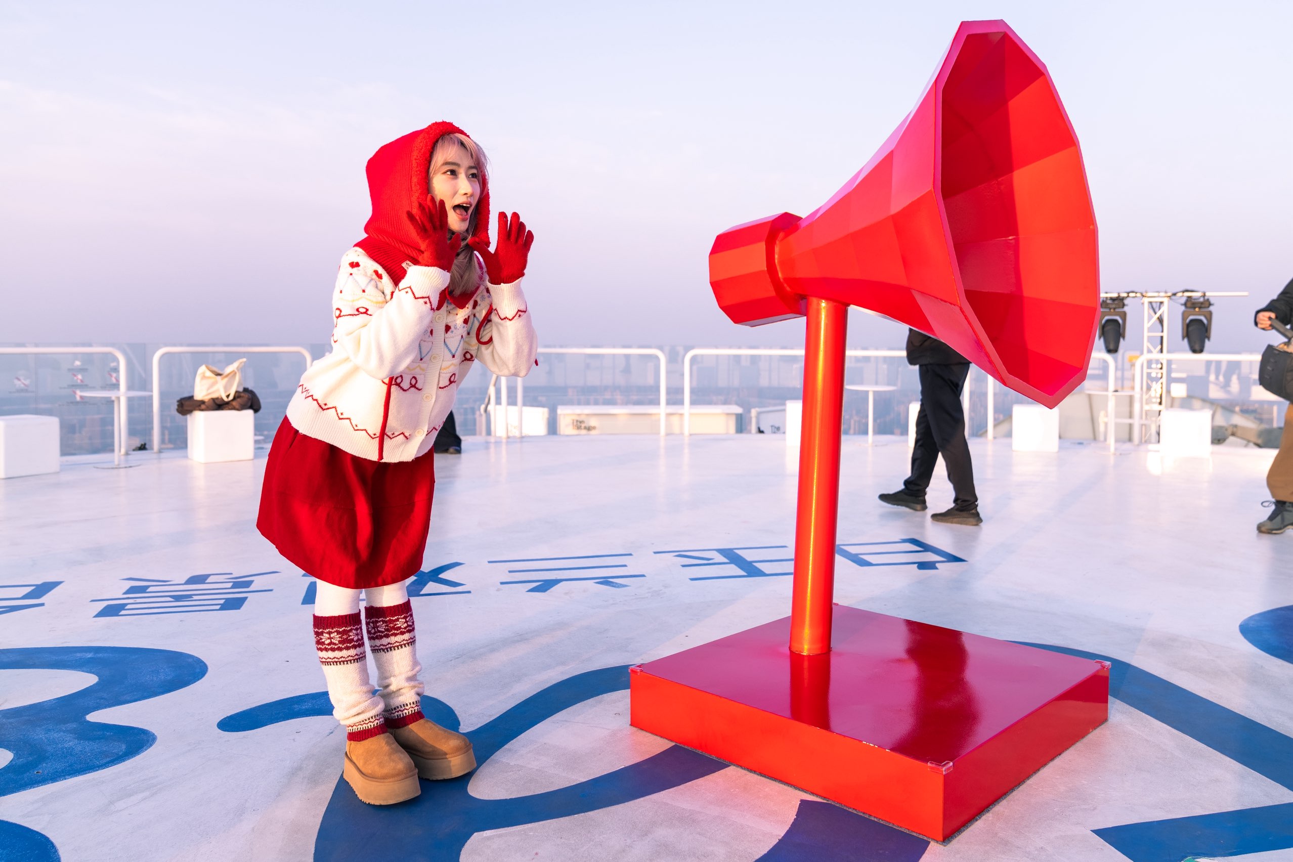 现场,观景台核心区域已搭建起一座高1.8米的喇叭造型红色声波装置,醒目亮眼,与新春喜庆氛围完美契合。工作人员介绍,这座“大喇叭”声波装置承载着“愿力成真”的美好寓意,游客的每一句心愿,都将化作“城市的回响”,陪伴大家开启一整年的好声量、好运气。
