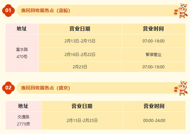 春节期间,万里辖区共安排2个惠民回收服务点正常运营或缩短营业时间,保障居民可回收物交投需求。居民可就近选择服务站点进行交投。详细清单如下: