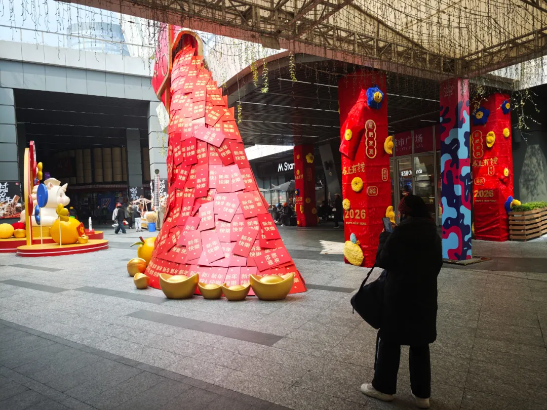 商场室内,另一组“马上有钱”主题美陈更是将新春吉祥意趣拉满。通体火红的展台铺满整个中庭,地面上“2026马上有钱”的白色大字格外吸睛。