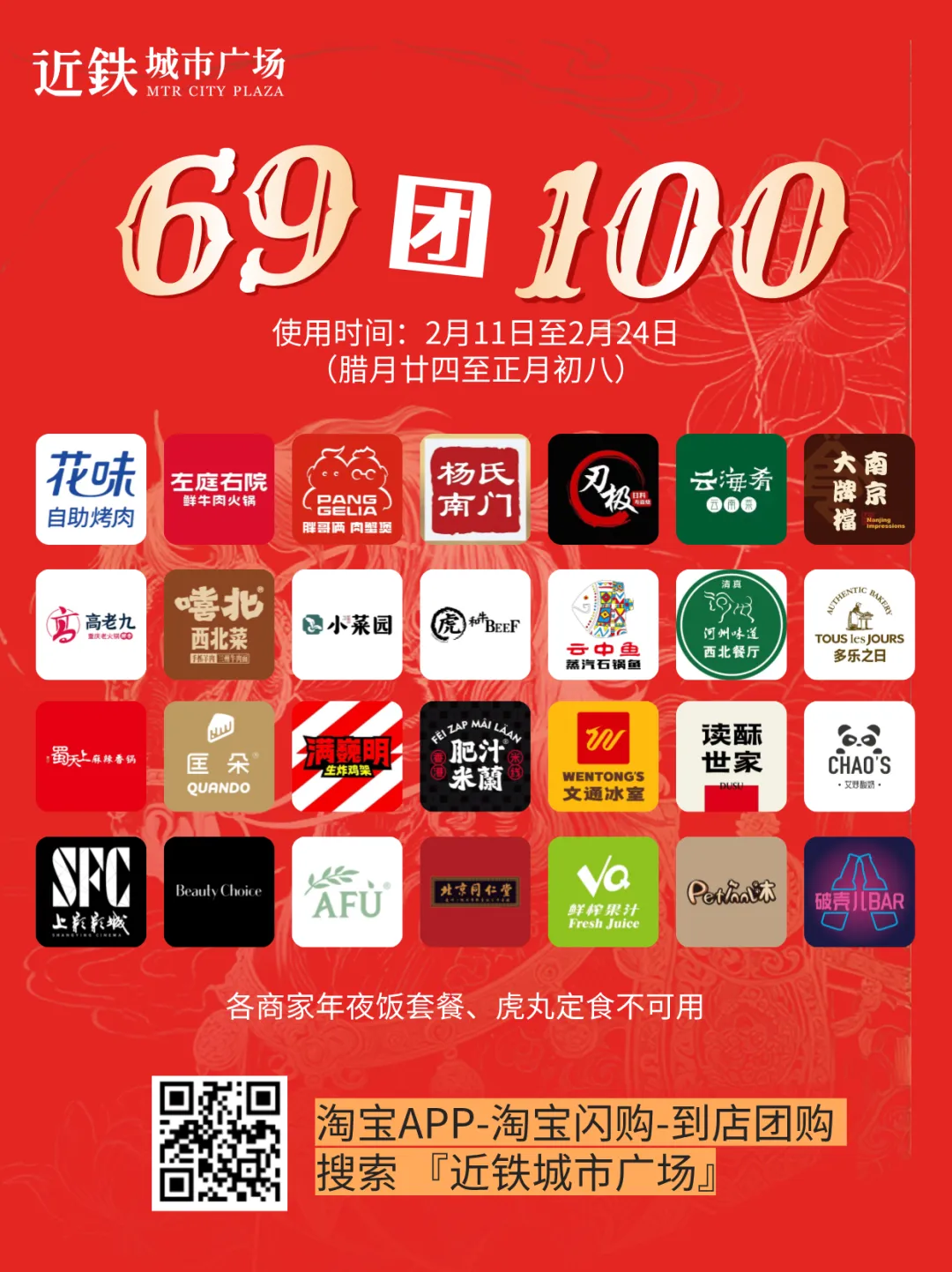年味十足的美陈之外,近铁城市广场更推出重磅餐饮团购福利,让市民的新春欢聚更具性价比。即日起至2月24日(腊月廿四至正月初八),市民可在淘宝APP的淘宝闪购到店团购板块,搜索“近铁城市广场”,参与69元团购100元代金券的活动。