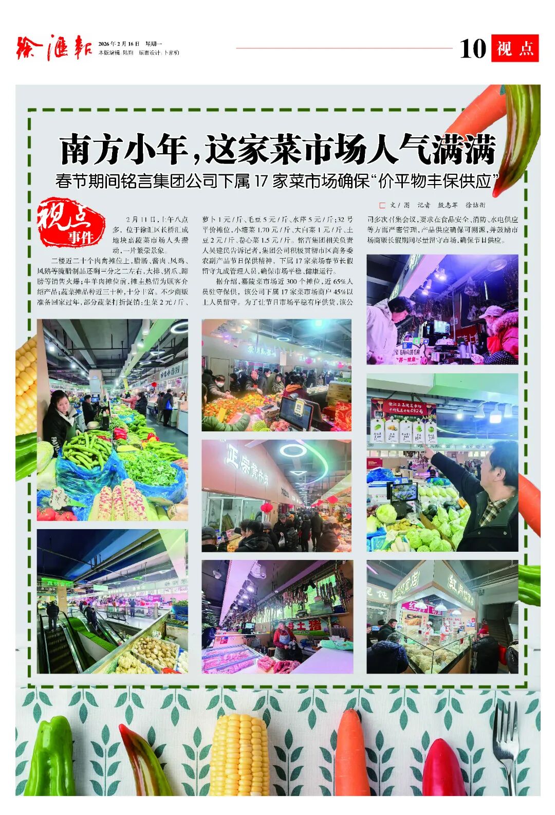 2月11日上午八点多,时值南方小年,徐汇长桥街道嘉陵菜市场人头攒动。二楼肉禽摊位腌腊制品、猪牛羊肉热销;部分蔬菜打折。市场繁荣背后,是铭言集团节前开启“价平物丰保供应”频道:从山东特供基地运菜平抑节日价格;为鼓励销售,蔬菜销量每满30公斤奖励100元。公司副总经理称,为贯彻市、区商务委保供精神,下属17家菜场春节留守九成管理人员;商户留守平均超35%。嘉陵菜市场近300摊位,近65%人员驻守,确保市民春节买得放心、满意。