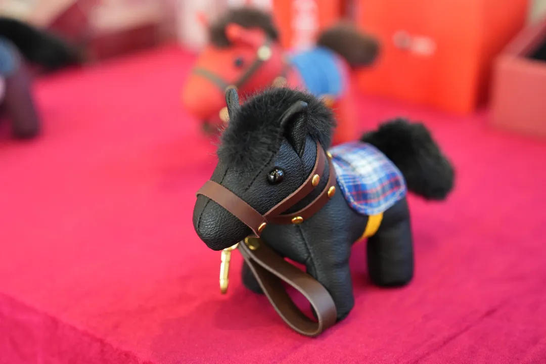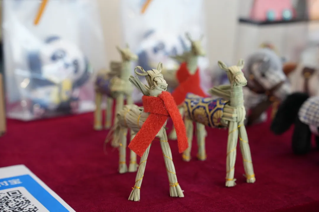 走进练塘服务区大厅,最引人注目的是憨态可掬的阿特麦土布小马。这一源自练塘传统土布工艺的创新作品,将蓝印花布与现代设计巧妙结合,既保留了乡土记忆的温润触感,又增添了新春的灵动气息。一旁陈列的茭白叶编织作品同样吸睛——作为当地“田头艺术”的代表,经巧手处理后的茭白叶化作栩栩如生的小马摆件、实用收纳篮,让原本废弃的农业副产品焕发出新的生命力。