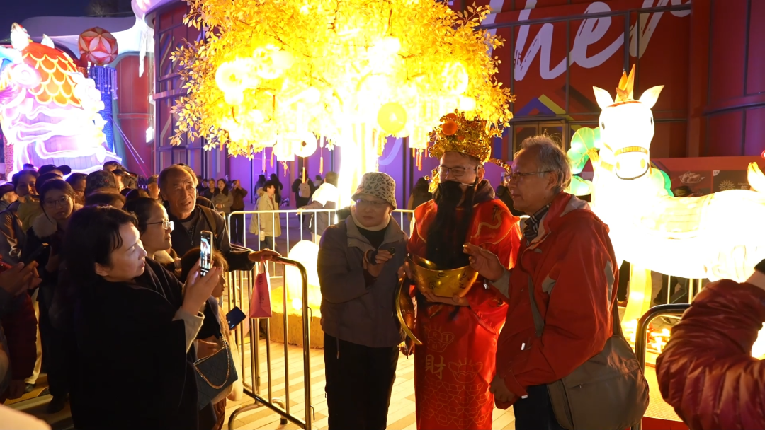 6米高的“福树”挂满了金灿灿的金元宝和红包,象征着“大吉大利、金银满屋”,是市民祈福打卡的热门点位,现场“财神爷”派发金币更是把气氛推向高潮。
