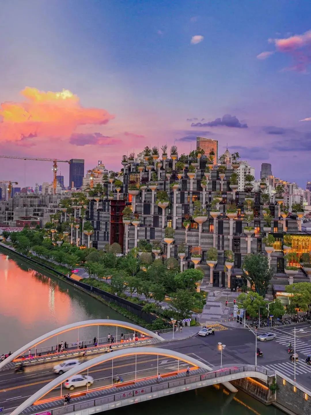 天安千树位于苏州河畔的“悬浮森林”,整体创意以黄山为设计灵感,千树造型形态各异,河畔绿荫环绕山丘,融入1公里长的滨河步道和公共公园。此地原为阜丰福新面粉厂旧址,现仍存有4栋历史保护建筑,为公众提供了一个集休闲、购物、艺术于一体的场所。